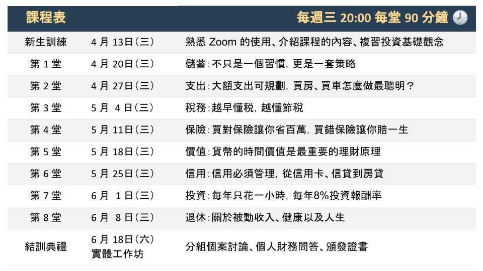 每週一堂課,用八堂課逐步建立理財重要觀念,從儲蓄學到投資,從信用管理懂到風險管理,讓你徹底學會如何把錢管好。